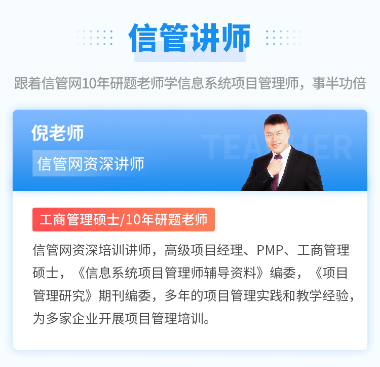 信管網(wǎng)為信息化考試與服務(wù)專業(yè)平臺(tái),目前開設(shè)有信息系統(tǒng)項(xiàng)目管理師、系統(tǒng)規(guī)劃與管理師、系統(tǒng)集成項(xiàng)目管理工程師、信息安全工程師考試與學(xué)習(xí)服務(wù)。提供了包括考試報(bào)名、考試課程、成績(jī)查詢、真題發(fā)布、資料下載、案例分析、論文、考試教程、在線題庫(kù)、每日一練、章節(jié)練習(xí)、信管人才、論壇交流等服務(wù)。我們將為廣大信管考友提供專業(yè)、及時(shí)、全面、貼心的考試服務(wù),立足于為廣大信管考友建造一個(gè)優(yōu)質(zhì)的學(xué)習(xí)平臺(tái),讓考生都能夠享受學(xué)習(xí),順利通關(guān)。